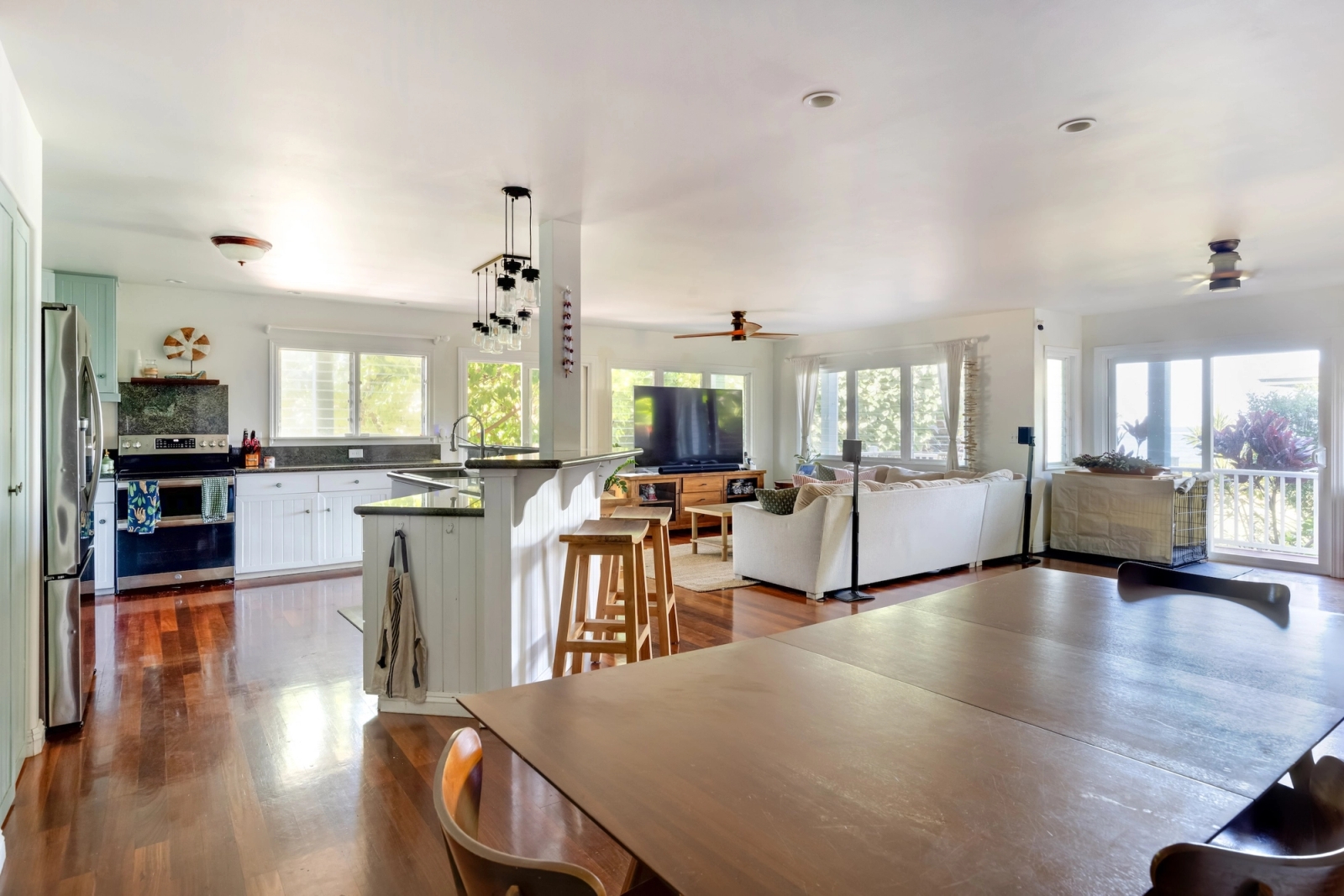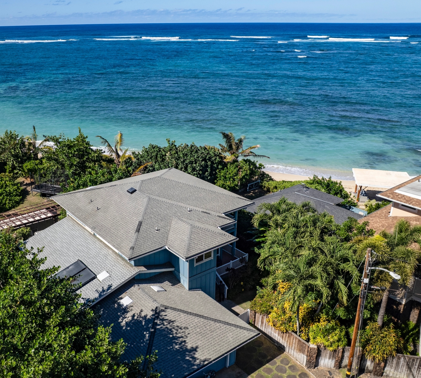 Welcome to 68-17 Laau Paina Place, a rare oceanfront property where the beach becomes an extension of your home. Step directly from your private beachfront lanai onto the sand. The main house is two stories with 4 beds, an office, a garage, and 4 baths, featuring an open floor plan and ocean views from nearly every room plus two covered ocean-facing lanais. The second home is an original 1940s cottage with 2 beds and 1 bath and an oceanfront patio. Waves break on the outer reef, leaving the beach swimmable year-round. Positioned in front of Devil’s Rock, renowned for big-wave surfing, tow-surfing, diving, and scuba. Launch jet skis from your front yard. Split A/C, separate meters, and septic. 1 of 4 beachfront homes within this 17-home neighborhood. Deeded beach access for Laau Paina Pl residents. Minutes from Haleiwa within easy reach of Honolulu and the airport. Mokuleia is known for empty beaches, scenic bike rides, polo fields, Dillingham Airfield, Dillingham Ranch, horseback riding, and hiking trails. Architectural renderings and photos 2-5 illustrate a potential kitchen-living area. Buyer to verify all information.