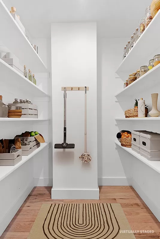 - **Luxurious Kitchen**: Designer kitchen with oversized cupboards, Quartz Calacatta Plaza countertops, dual garbage pull-out, oversized stainless-steel sink, and a full-sized GE stainless-steel appliance package. Features a Ceasar Stone quartz peninsula with a book-matched fabricated waterfall and a tranquil white hand-glazed ceramic elongated hexagon mosaic tile backsplash. Includes a walk-in pantry with custom shelving.