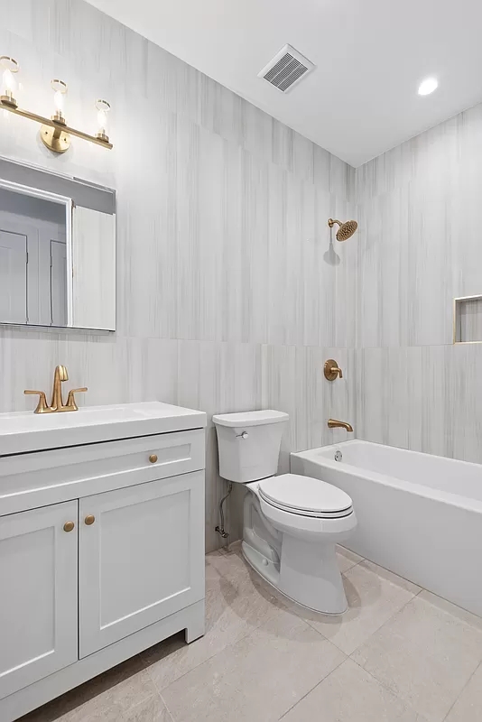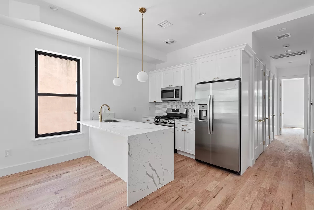 - **Spacious Living**: A four-bedroom, three-bathroom owner’s duplex with high ceilings, natural hardwood oak flooring, white cabinetry, and brushed brass hardware.