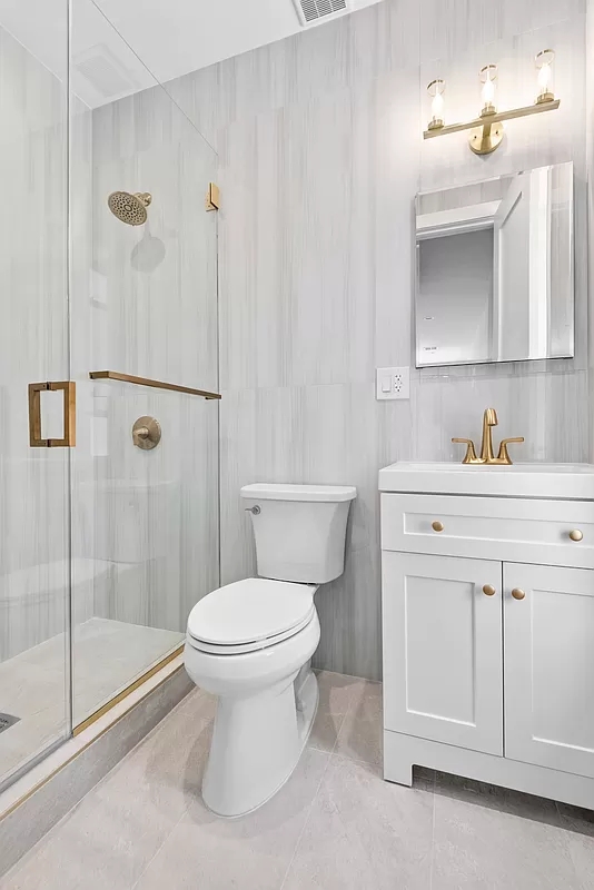 - Main bedroom accommodates a king-sized bed, custom built-in closet, and en-suite spa-inspired bathroom with stand-up shower, marble-inspired large format porcelain tile, recessed medicine cabinet, and satin brass fixtures by Kohler.