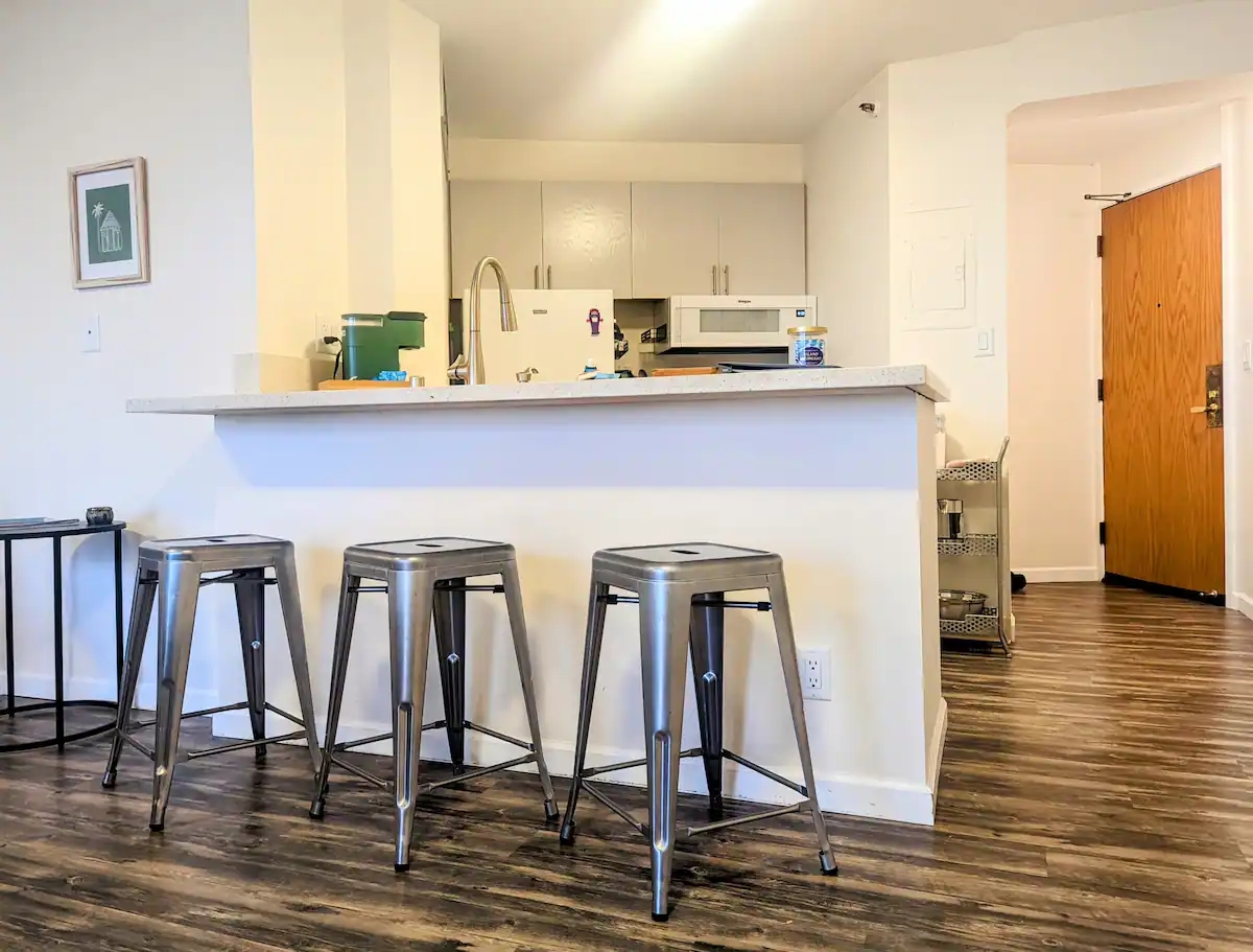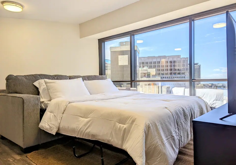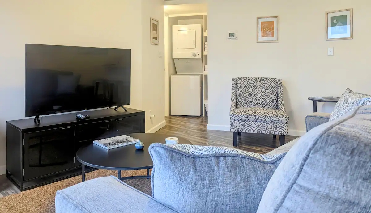 This is a one bedroom, one bathroom condo that was recently renovated with a modern aesthetic. The bedroom is furnished with a king size bed and equipped with blackout curtains. The livingroom has a queen size sleeper sofa with a memory foam mattress.