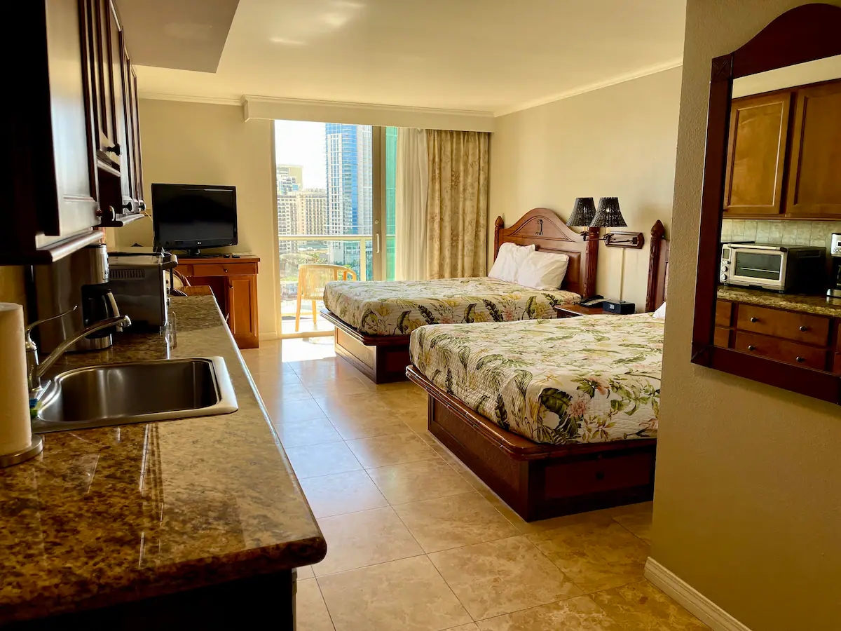 Step inside to discover a thoughtfully designed space, tastefully decorated in a modern Hawaiian style. The studio features two comfortable queen-sized beds, ensuring a restful night's sleep after a day of exploring Oahu's wonders. The furnishings create a welcoming atmosphere, providing a homey feel throughout.
