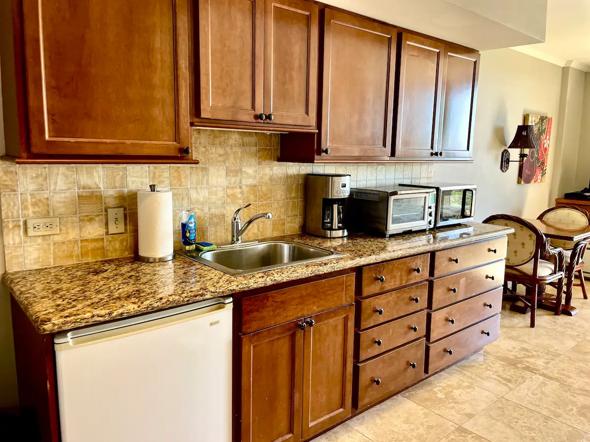 The well-equipped kitchenette allows for light meal preparation and includes essential amenities. Enjoy your morning coffee or a quick snack at the dining area, providing a convenient spot to refuel before your island adventures.