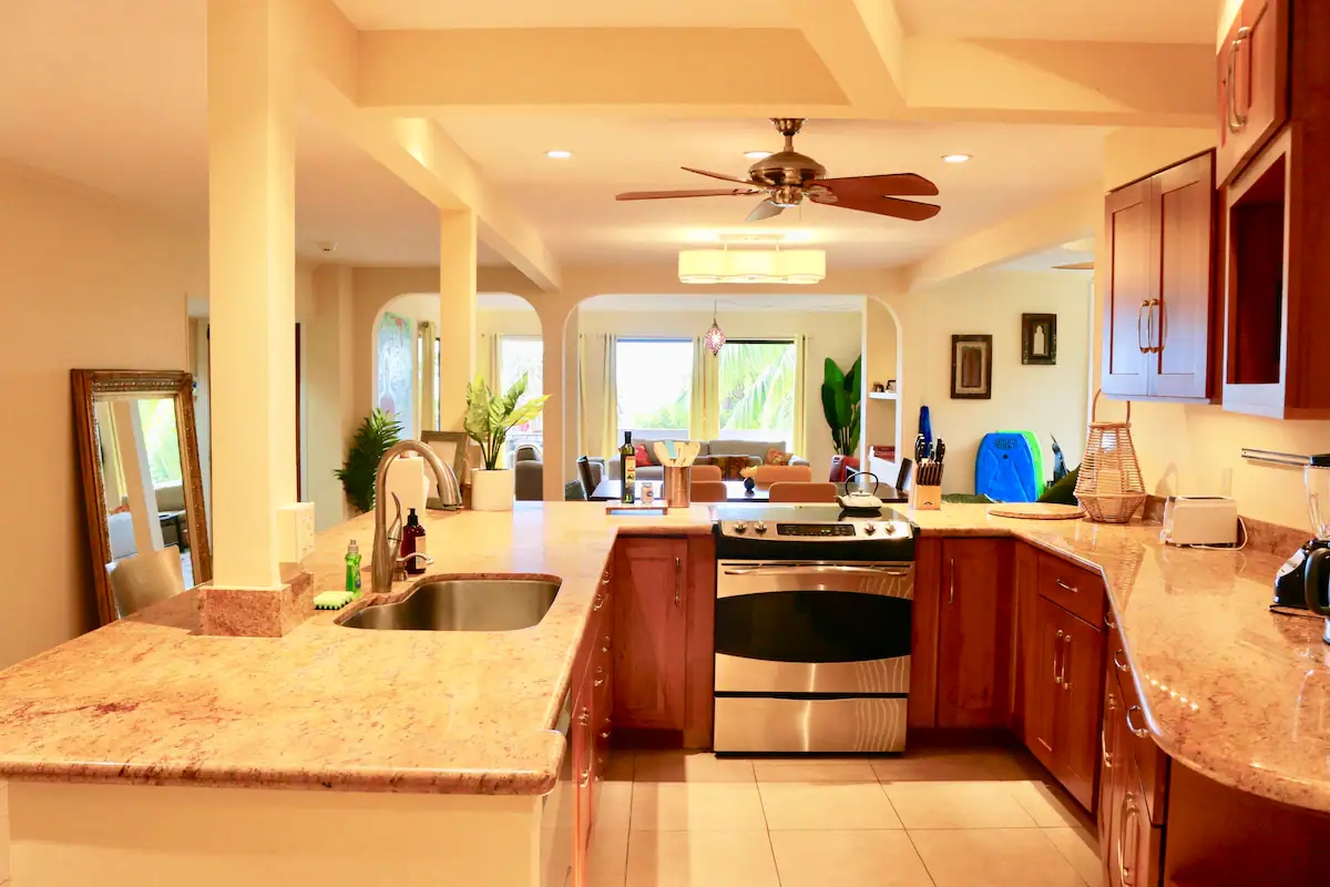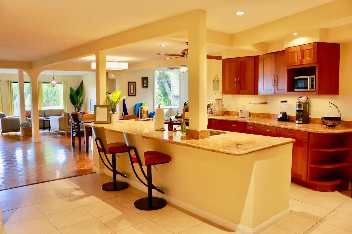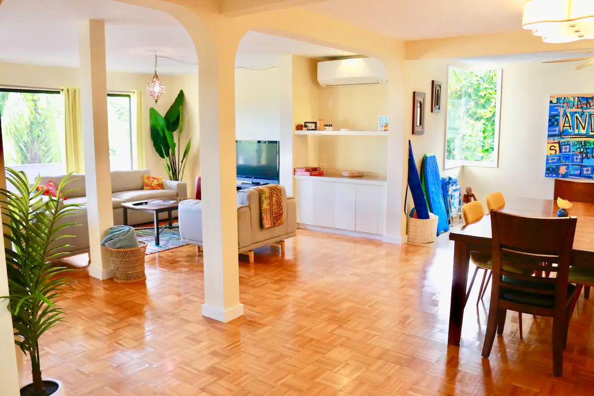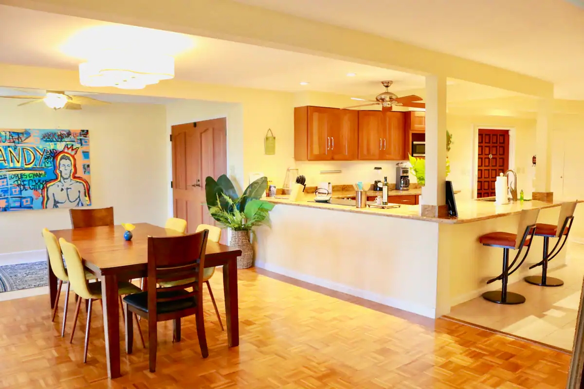 This retreat also boasts a full kitchen and a large lanai, perfect for enjoying your morning coffee or soaking up the beautiful Hawaiian sunsets. To beat the summer heat, there is air conditioning to keep you cool and comfortable throughout your stay.
