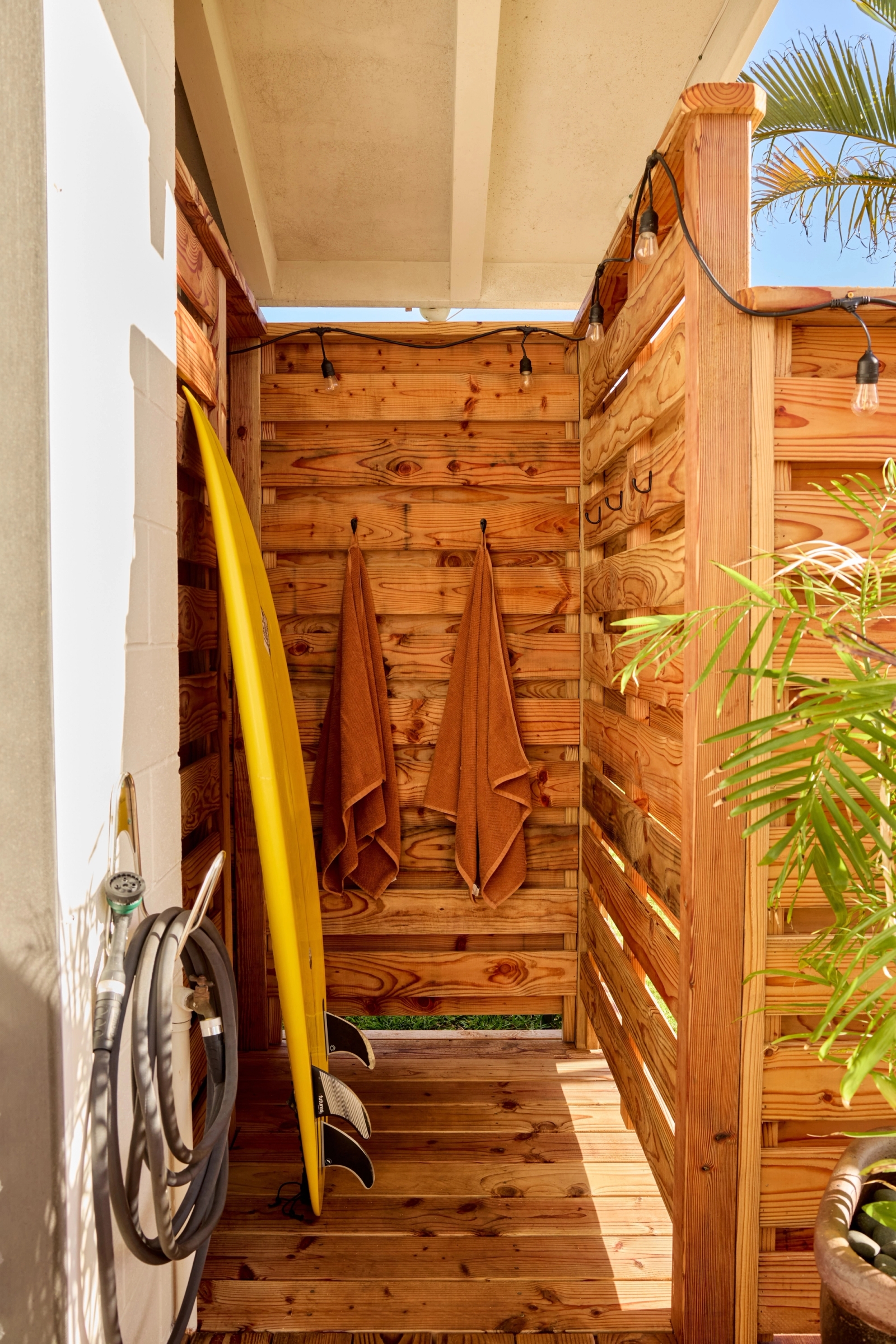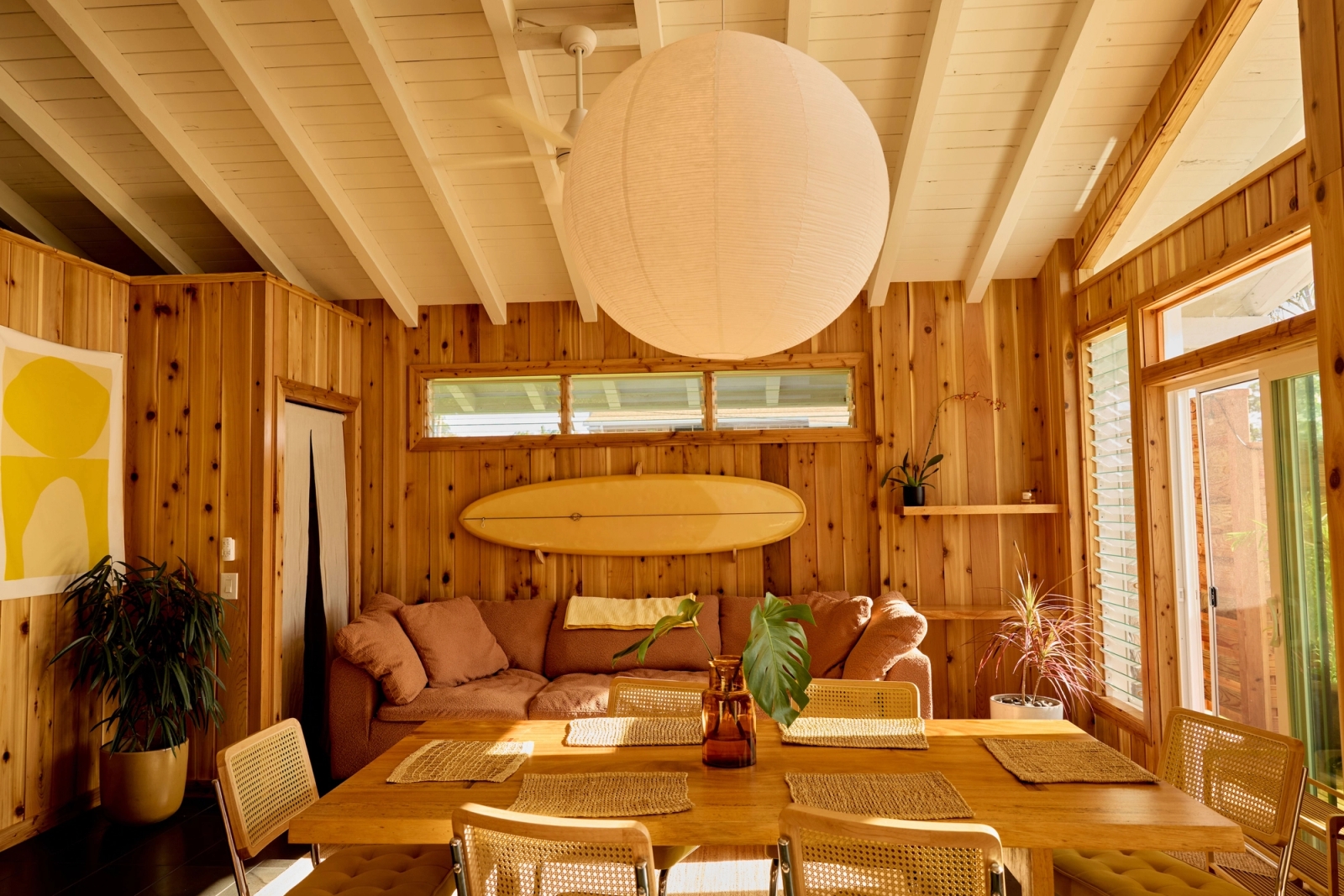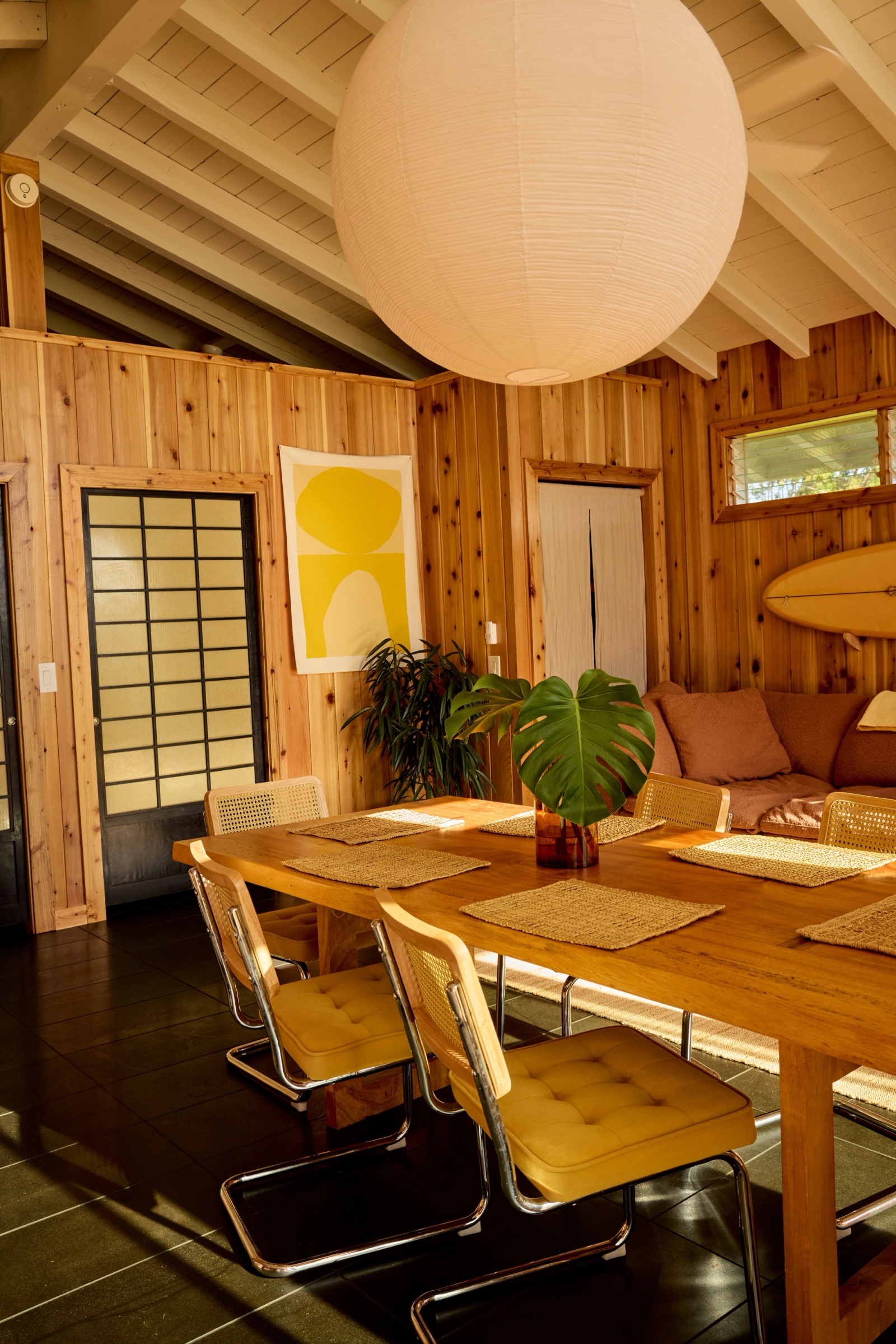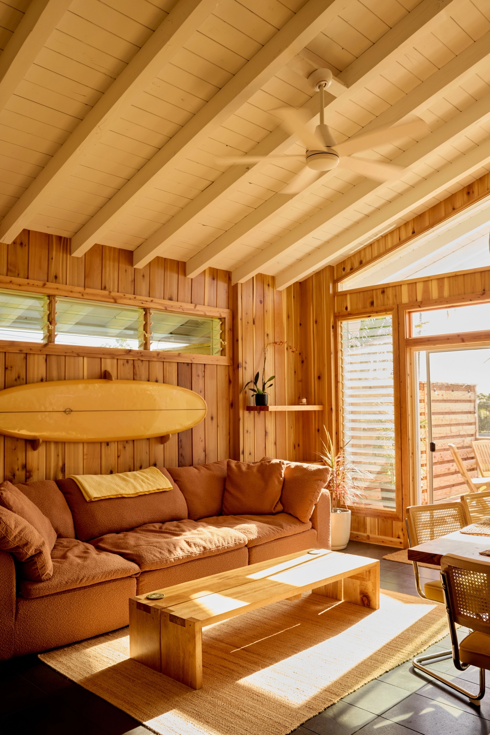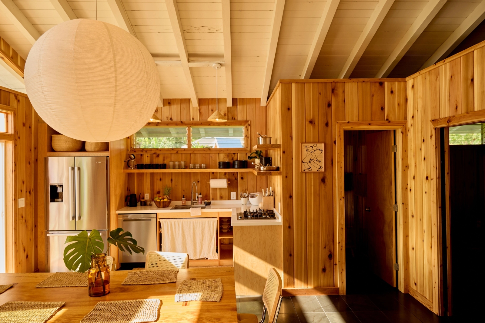Sleeps 5 guests: 1 king bed and 3 twin size bunk beds. The Cedar House is newly constructed, showcasing craftsmanship with cedar wood paneling, natural stone floors, high ceilings with fans, and custom-built bed frames. Sustainable features include shelves, dining table, and coffee table crafted from locally sourced albizia wood. The kitchen has handcrafted cabinets paired with Bosch appliances, Material Kitchen pans, Tiger rice cooker, Bodum French press, Vitamix, and an air fryer. Bedrooms offer warm lighting, memory foam mattresses with eco-linen bedding, and 55-inch flat-screen TVs. Step outside to an oversized deck with an outdoor shower, laundry room, lounge furniture, and a gas BBQ grill. Beach gear, towels, and surfboards provided. If you seek a curated and meticulously maintained space with all-natural cleaning products, you've found it!