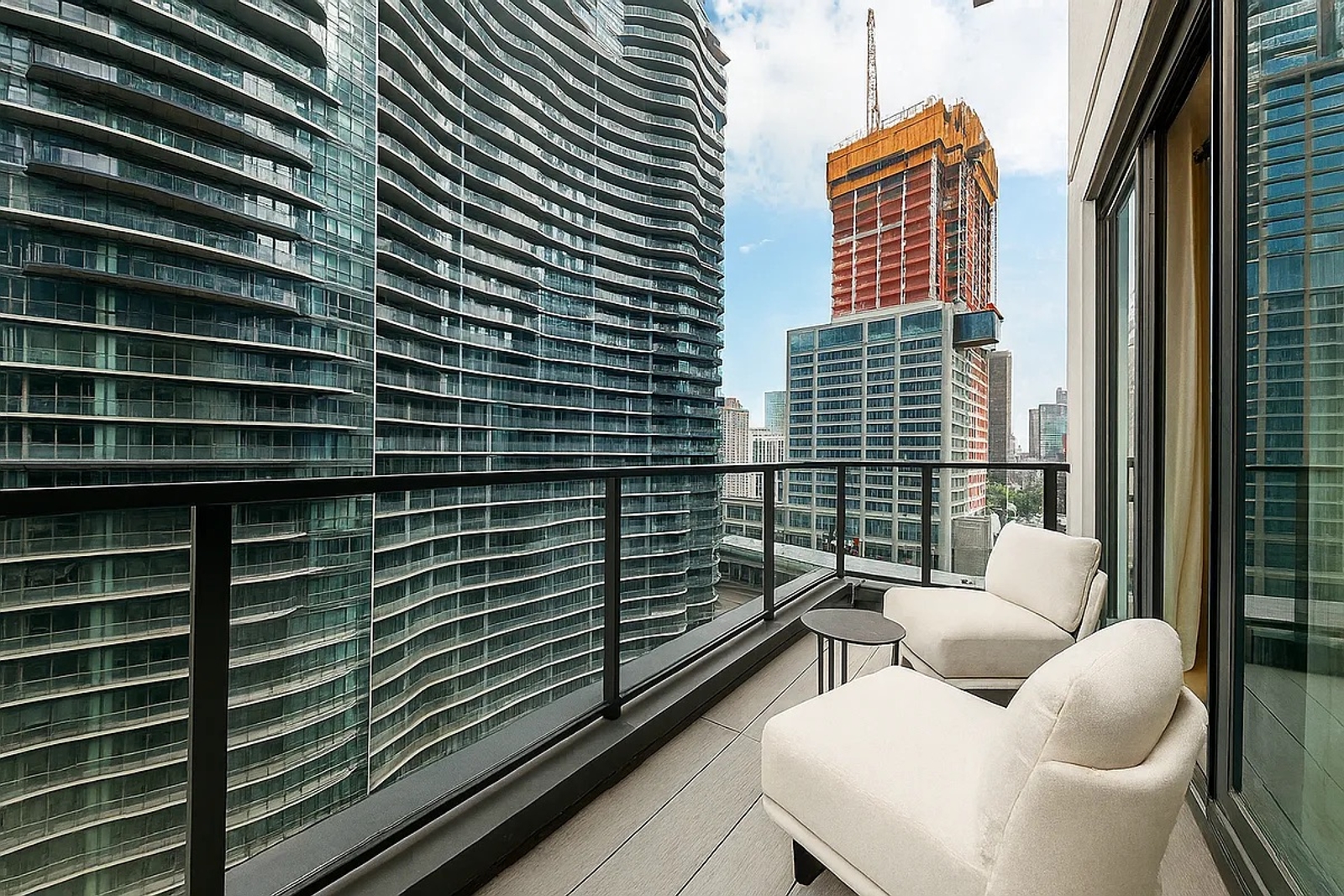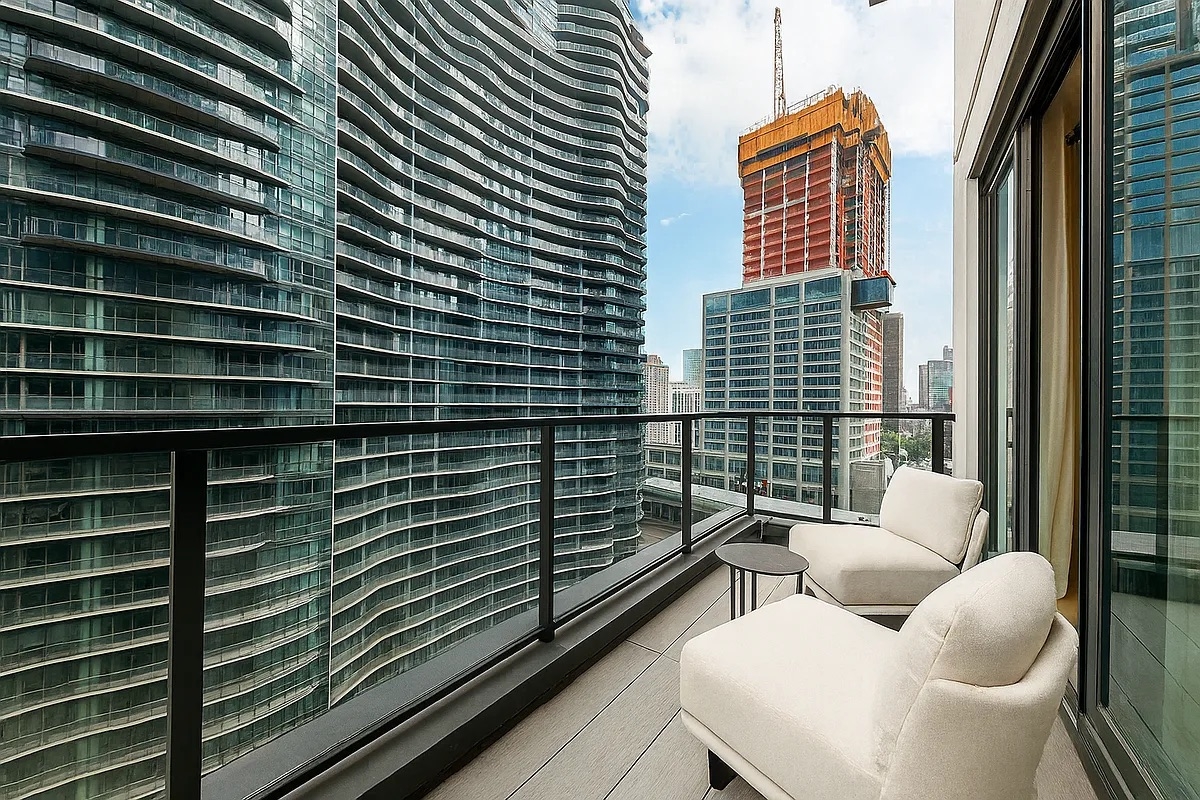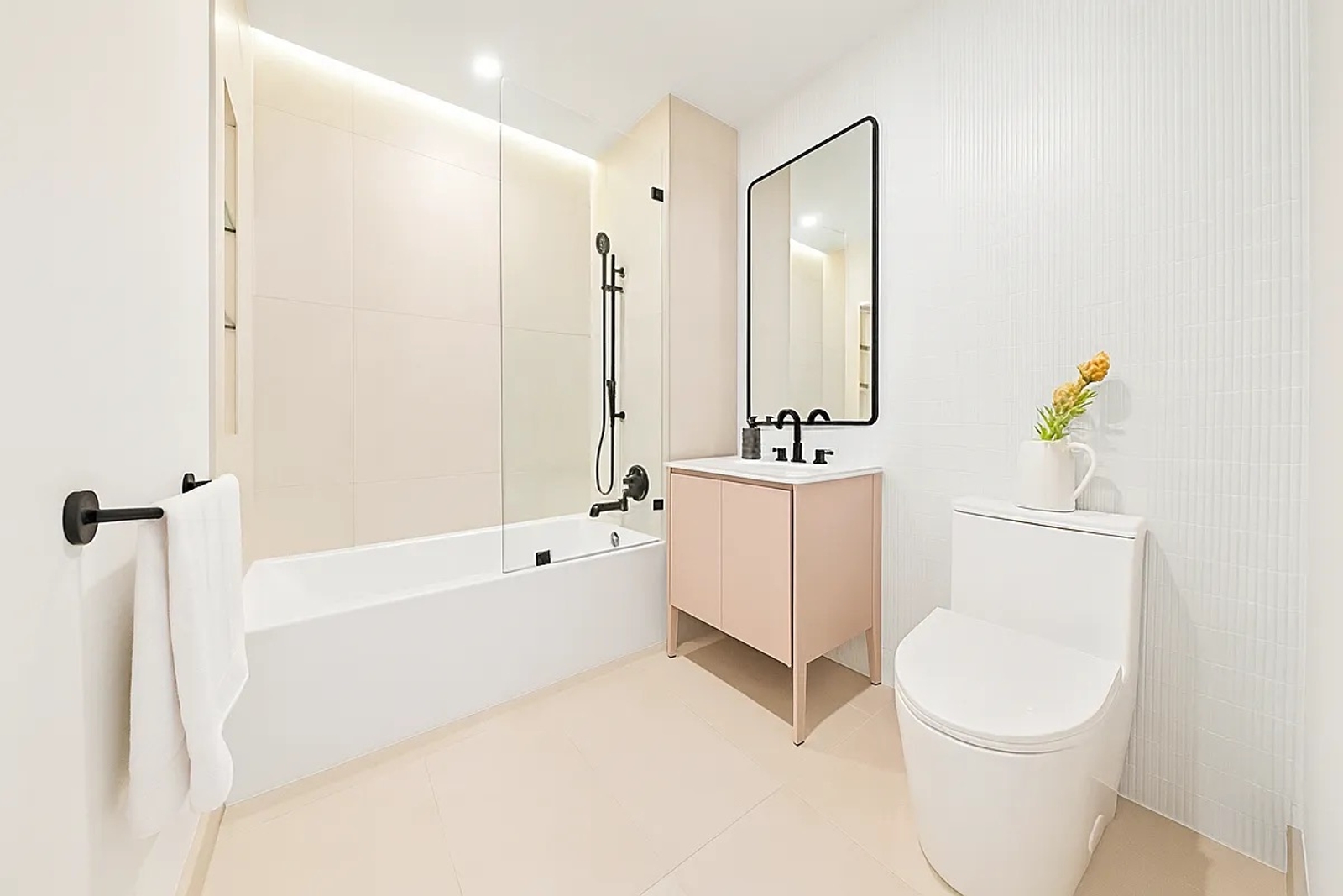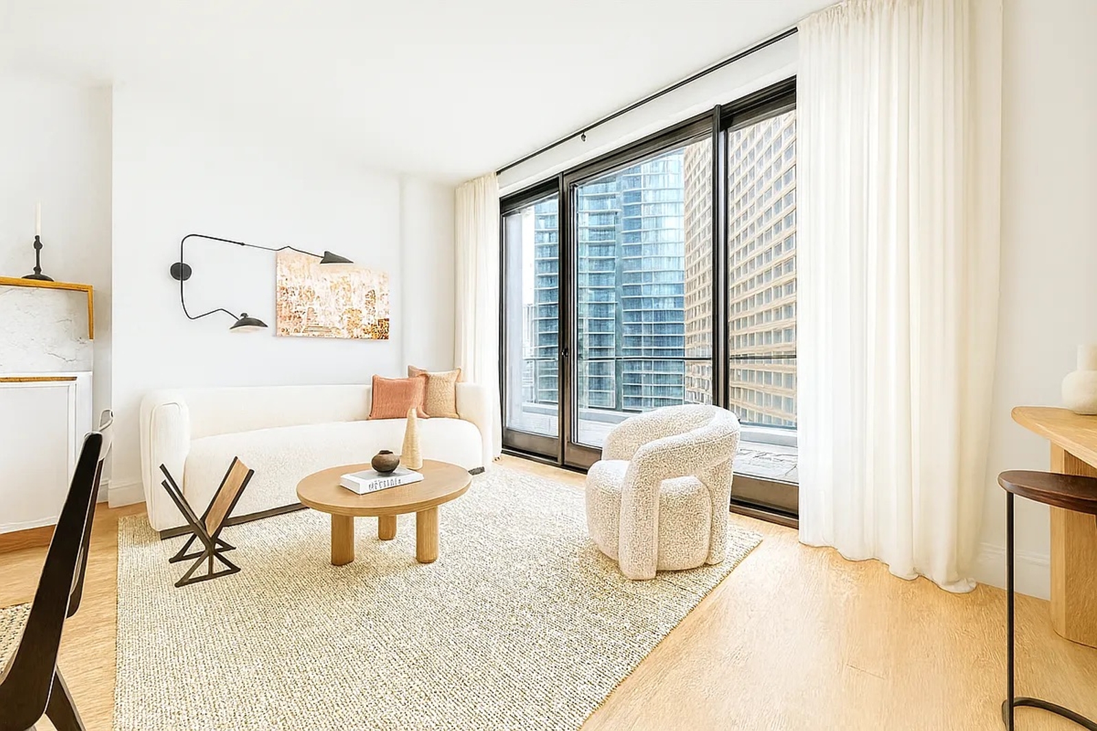 Residents have access to exceptional amenities, including a landscaped courtyard and rooftop with skyline views, a fitness center, coworking and resident lounges, a children’s playroom, pet spa, and attended lobby with secure package lockers.
