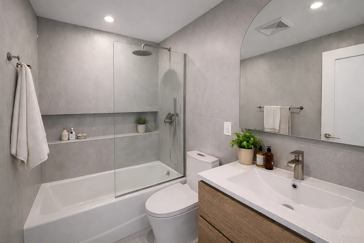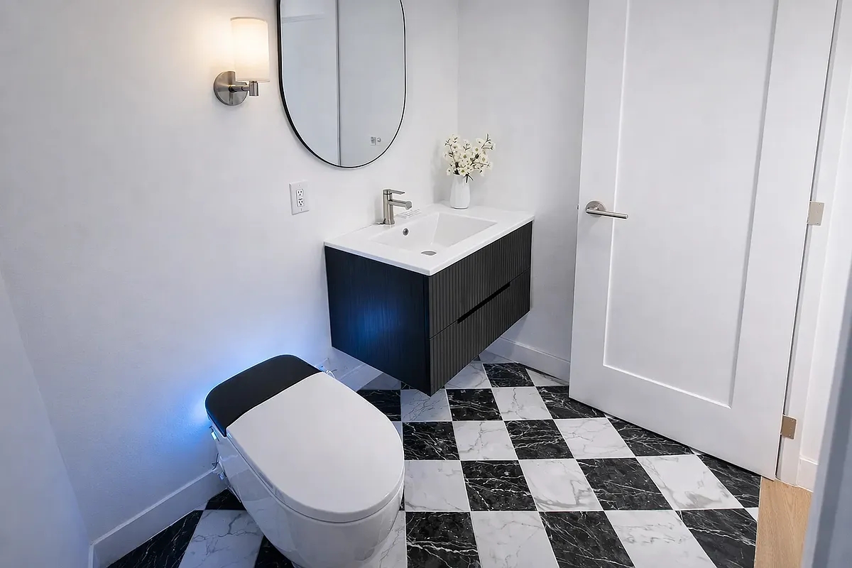 Bathrooms showcase modern finishes, including an arched LED mirror and smart toilet.