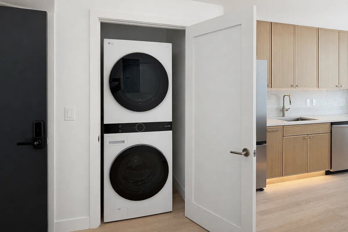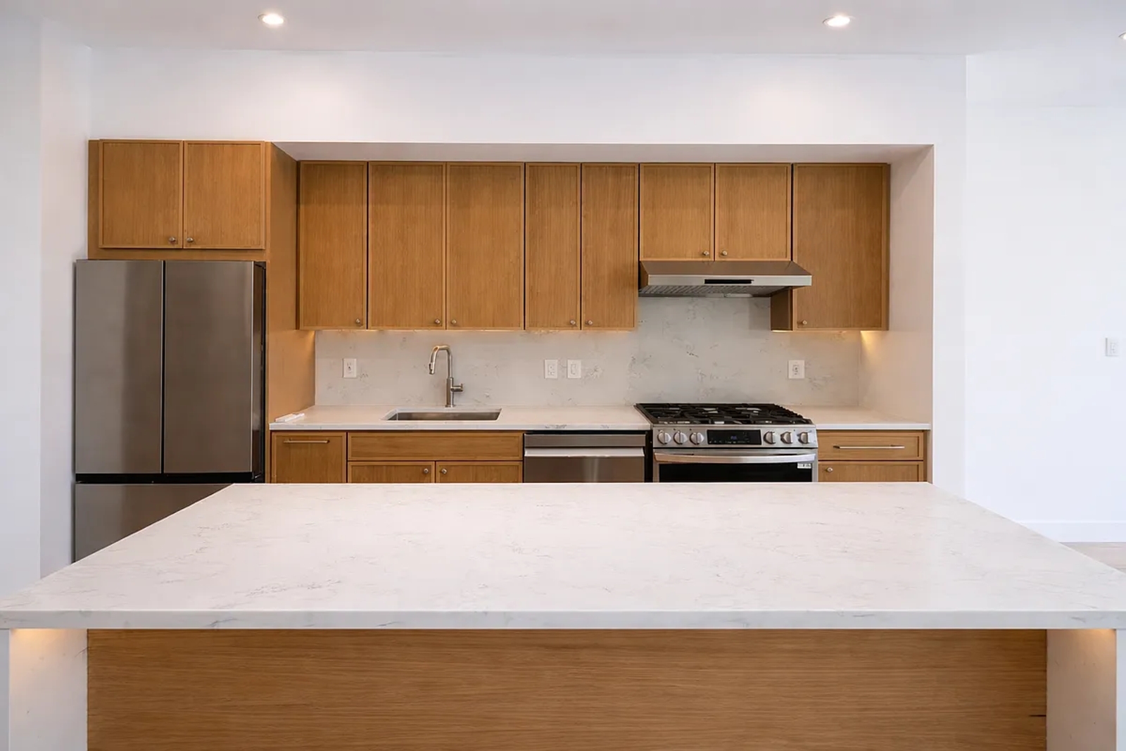 The kitchen features natural oak cabinetry, stone countertops, and a large island ideal for cooking, dining, or entertaining. All appliances are brand new, including a Samsung refrigerator and dishwasher, LG gas range, GE built-in microwave, and an in-unit LG washer and dryer.