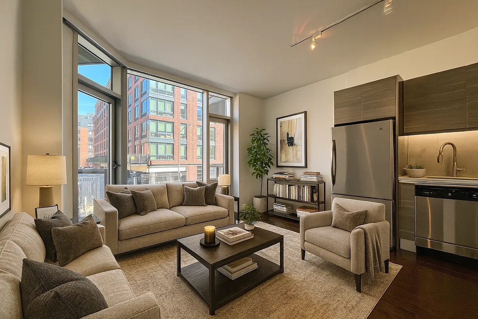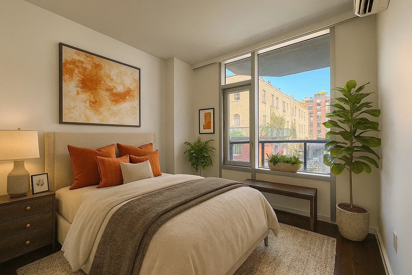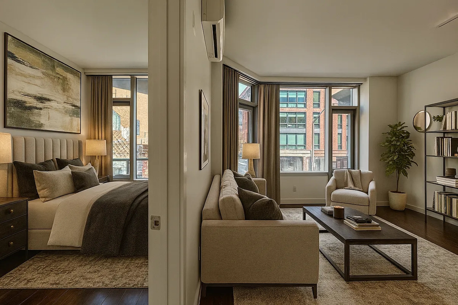 This bright, renovated apartment features an open living area, modern kitchen, and two spacious bedrooms that easily fit a queen bed. Bathrooms include a soaking tub and a separate walk-in shower with warm lighting and heated fixtures.